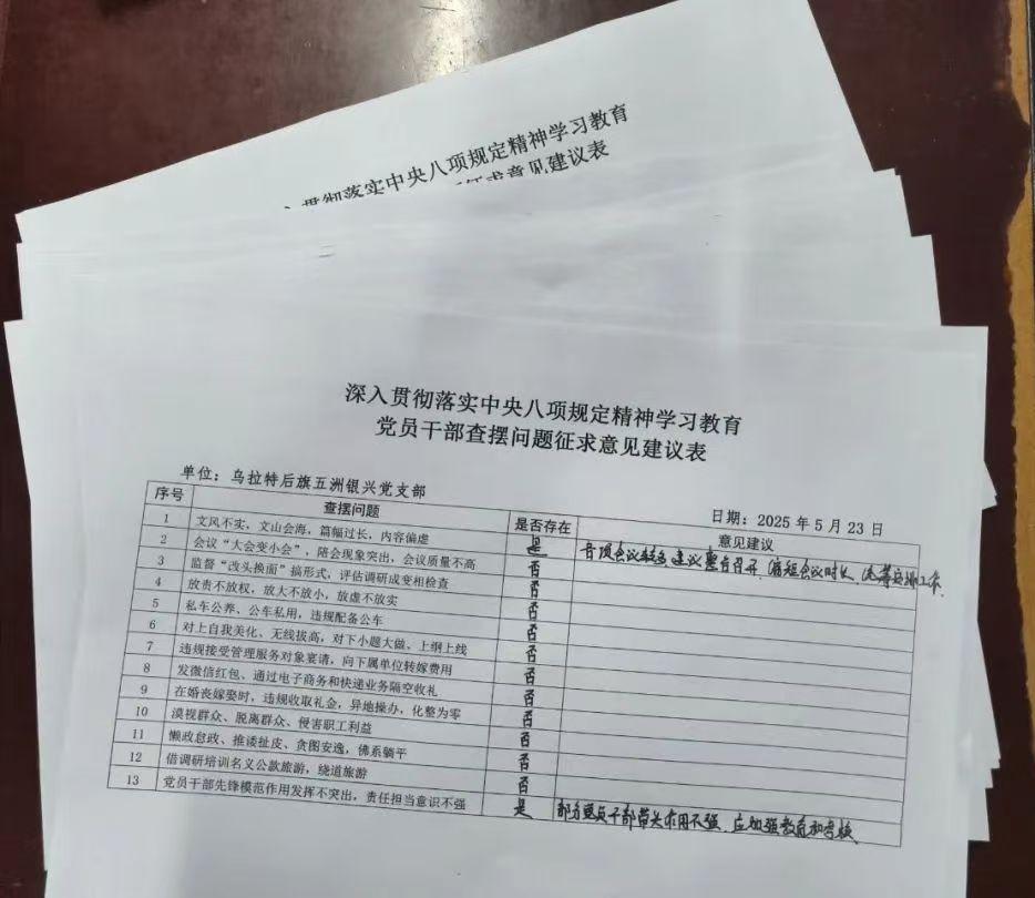 會上,大家對標習近平總書記關(guān)于加強黨的作風建設的重要論述和重要指示批示精神,對照《中央八項規(guī)定及其實施細則精神》,結(jié)合各自工作實際,堅持實事求是和問題導向原則,從思想引領(lǐng)、遵規(guī)守紀、作風建設、以學促干以及工作成效等方面做了全面查擺和自查自糾。同時緊扣中央八項規(guī)定內(nèi)容,從文風會風、推諉扯皮、擔當作為、公款旅游、隔空送禮等方面編制、印發(fā)了《黨員干部查擺問題征求意見表》,認真聽取黨員群眾的意見和建議。